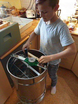 vaxkakorna runt och honungen slungas med hjälp av centrifugalkraften ut ur